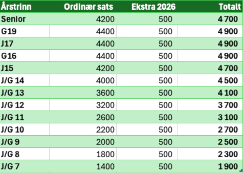 Treningsavgiften kreves inn i tre deler. Del 1 er på 50 % av totalen og sendes ut i januar. Del 2 og del 3 er på 25 % av totalen, og sendes ut i henholdsvis juni og september. Satsene øker med alderen, i takt med kostnadsnivået. Hvis en spiller av økonomiske årsaker ikke har mulighet til å betale treningsavgift, setter vi stor pris på om vedkommende kontakter styret.